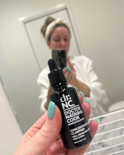 Next, I use a few drops to drop a few years with DrNC Cosmeceuticals Concentrated Clarifier, which is filled with AHAs and BHAs. It is specifically designed to produce new skin cells, exfoliate and even out my skin tone, and a little bit goes a long way.